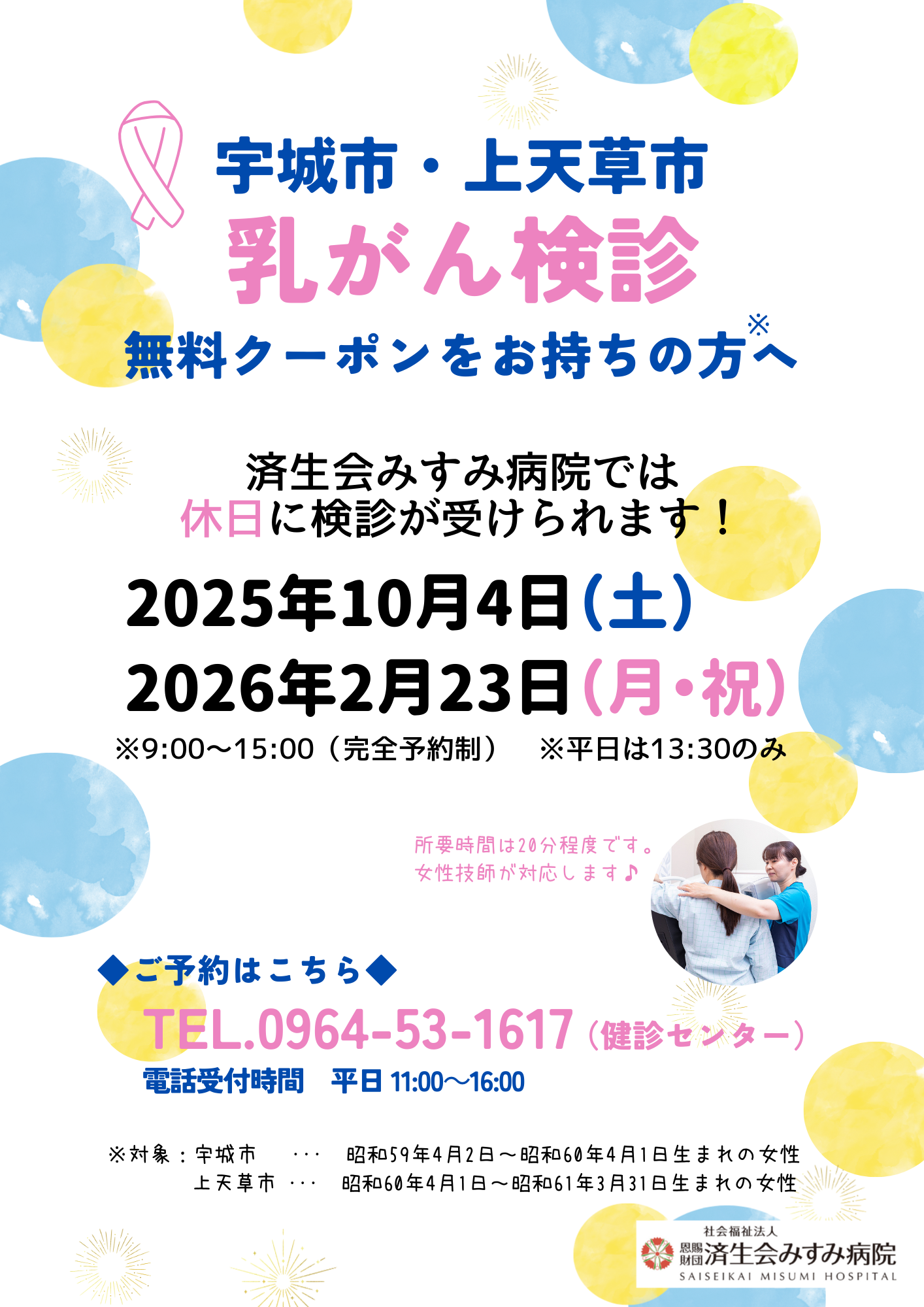 宇城市・上天草市の乳がん検診無料クーポンをお持ちの方へお知らせです。